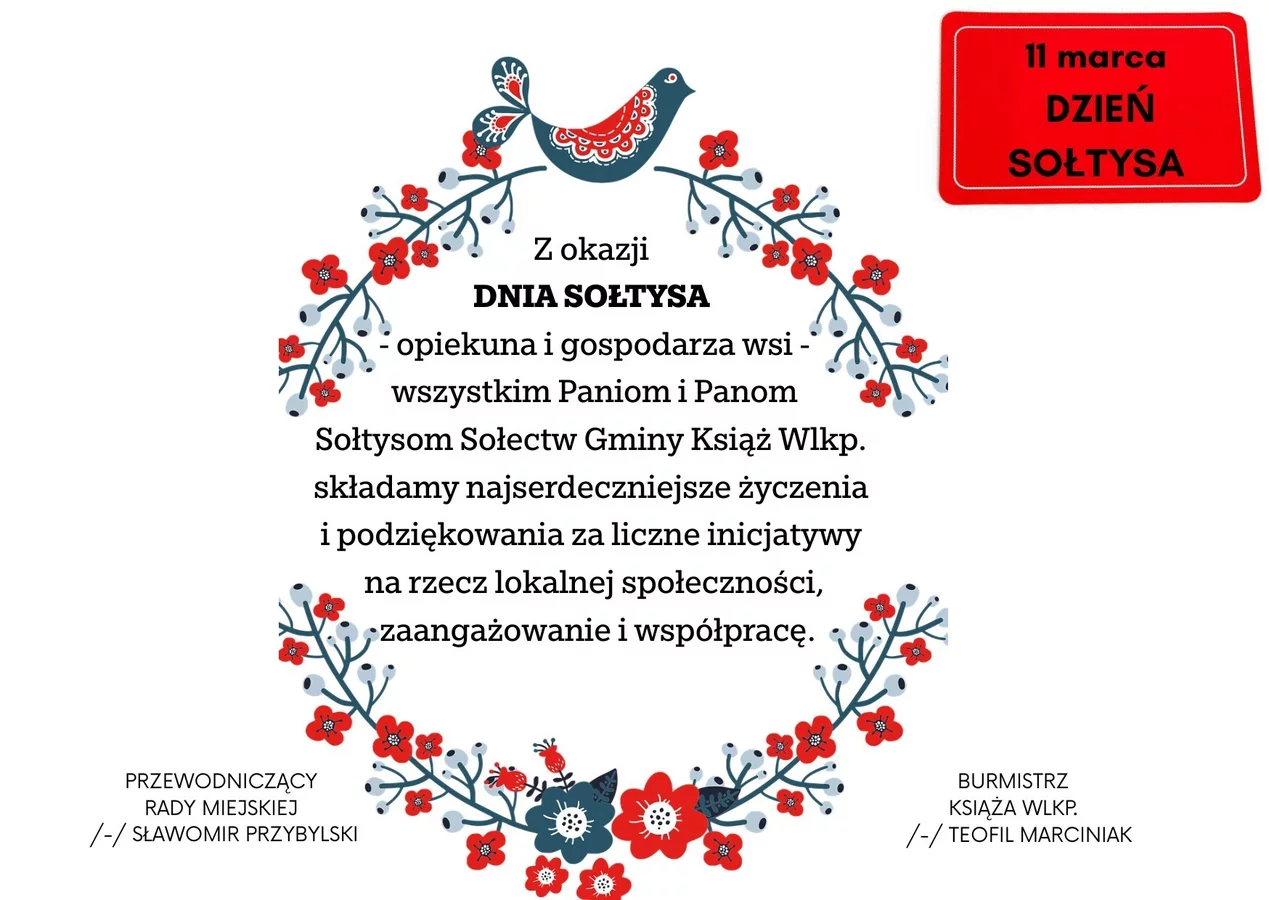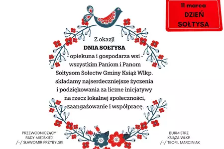 Na okoliczność przypadającą 11 marca, święto Dnia Sołtysa najserdeczniejsze życzenia dla sołtysów Gminy Książ Wlkp. zdrowia, determinacji w realizacji wyznaczonych celów, chęci do podejmowania inicjatyw oraz satysfakcji z wykonywanej służby. W Gminie Książ Wlkp. mamy 20 sołtysów reprezentujących 20 sołectw, na czele których stoją osoby, które każdego dnia dbają o rozwój swoich miejscowości i dobro mieszkańców.