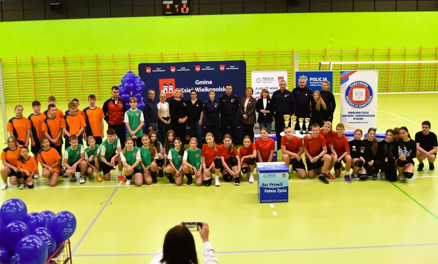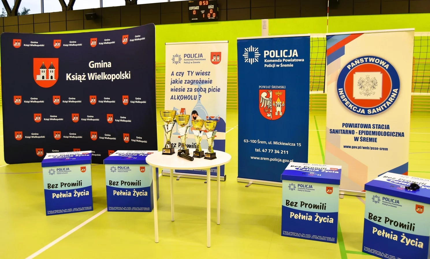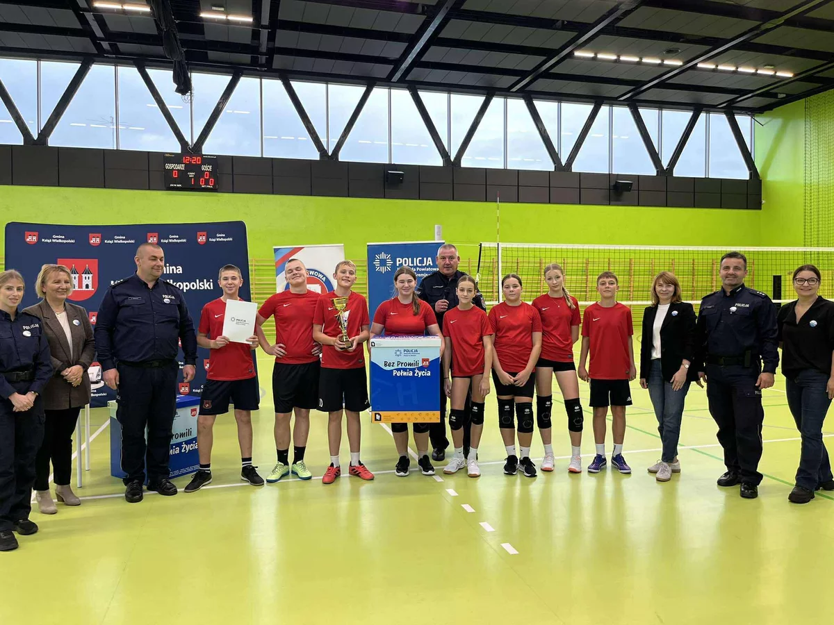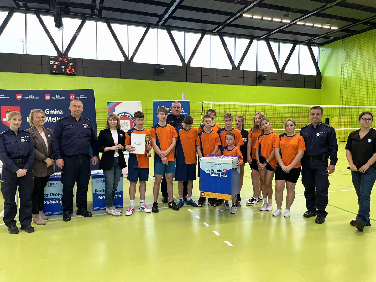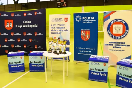Kontynuacją tych działań było wydarzenie zorganizowane w piątek, 24 października przez Komendę Powiatową Policji w Śremie, Urząd Miejski w Książu Wlkp. oraz Centrum Kultury Książ Wlkp. W hali widowiskowo-sportowej w Książu Wlkp. odbył się Turniej Piłki Siatkowej o Puchar Komendanta Powiatowego Policji w Śremie oraz Burmistrza Książa Wlkp., skierowany do uczniów klas VII-VIII szkół podstawowych naszej Gminy. Celem turnieju było nie tylko propagowanie zdrowej rywalizacji i aktywnego stylu życia, ale przede wszystkim zwrócenie uwagi młodzieży na wartości płynące z życia wolnego od alkoholu i innych używek. Sport, dobra zabawa i współpraca zespołowa miały być przykładem tego, że prawdziwa „pełnia życia” to energia, przyjaźń i zdrowa aktywność. W sportowe szranki stanęły drużyny ze szkół podstawowych w Książu Wlkp., Mchach, Konarzycach i Chwałkowie Kościelnym. Każdy zespół przystąpił do rywalizacji z ogromnym zaangażowaniem, a na trybunach nie zabrakło gorących emocji i dopingu. Kibice - uczniowie, nauczyciele - wspierali swoich zawodników z całych sił, prezentując kolorowe transparenty przygotowane w ramach konkursu towarzyszącego akcji „Bez Promili - Pełnia Życia”.