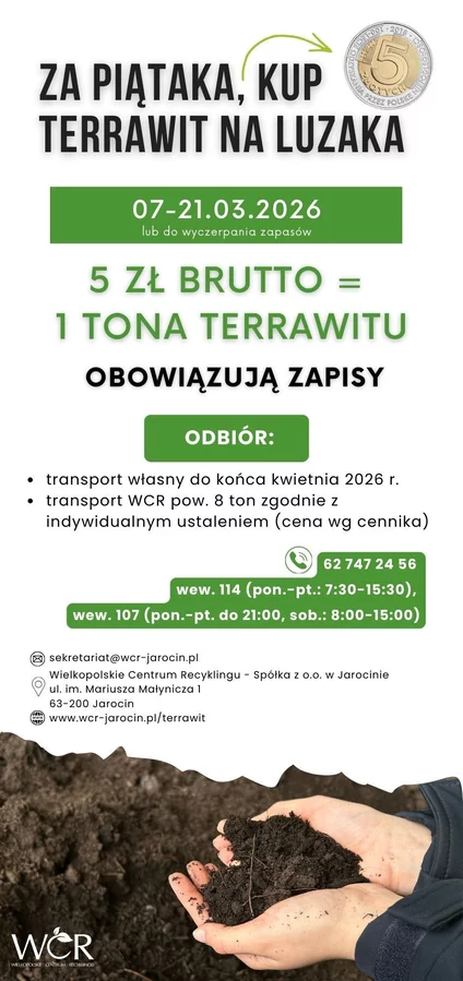 Wielkopolskie Centrum Recyklingu (WCR) Sp. z o.o. w Jarocinie zaprasza do włączenia się w akcję „Za piątaka, kup Terrawit na luzaka”.