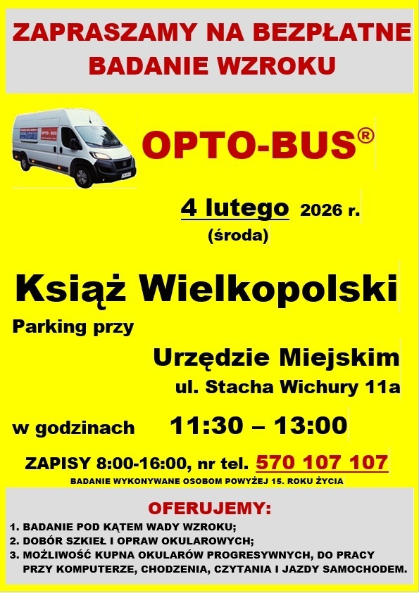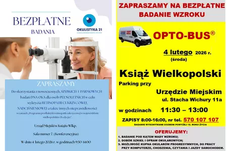 Urząd Miejski w Książu Wlkp. zaprasza mieszkańców do skorzystania z bezpłatnych badań wzroku, które odbędą się w środę, 4 lutego 2026 roku.