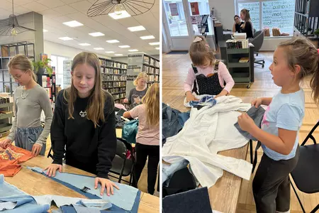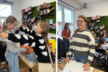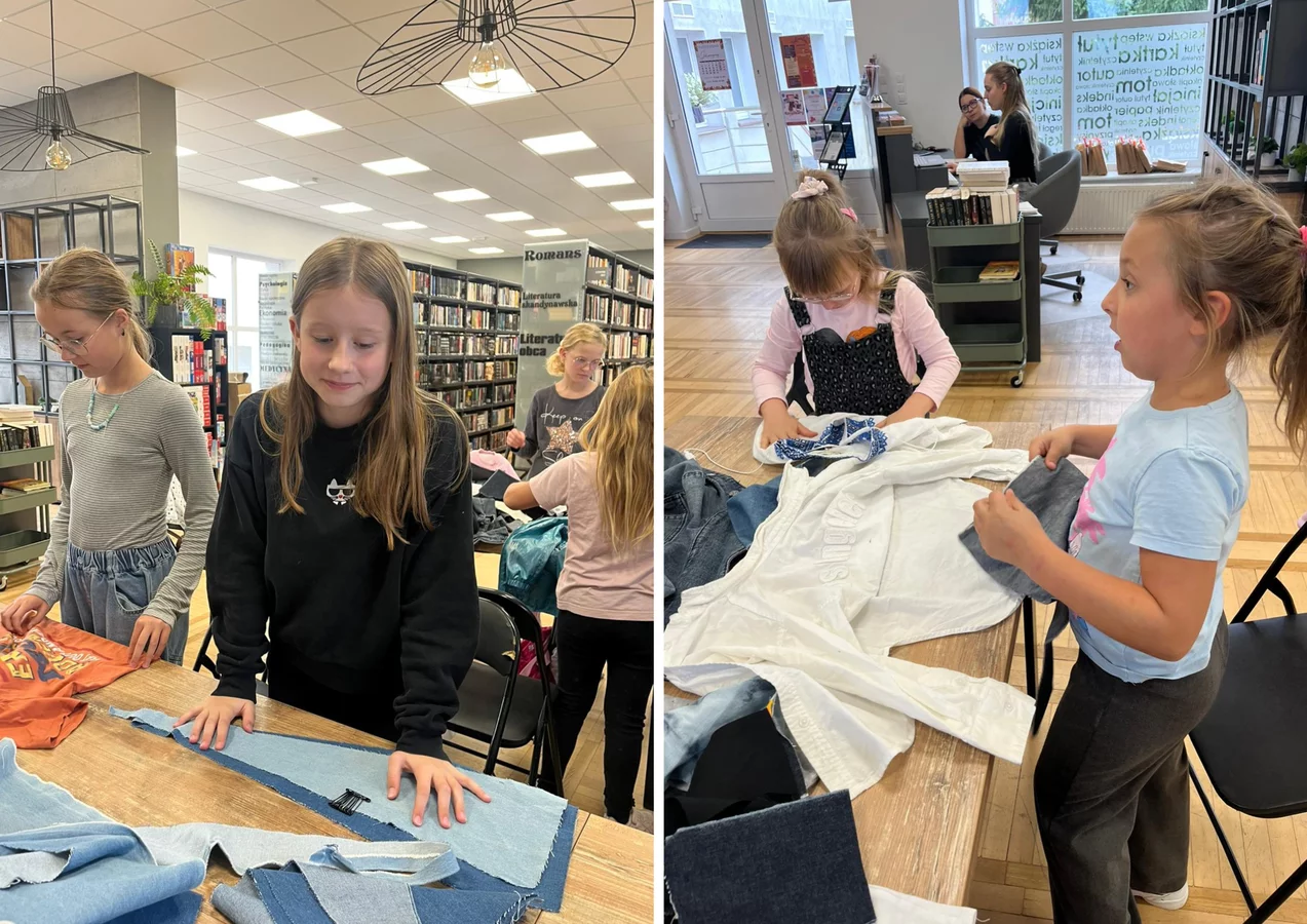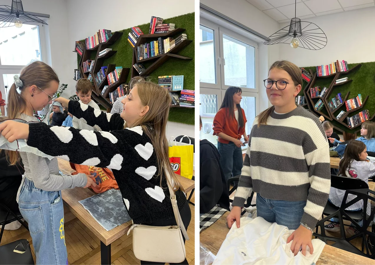 Dyrektor Centrum Kultury Książ Wlkp. Mariola Kaźmierczak wraz z instruktorkami zajęć Julią Kromolicką i Tetianą Baran w piątek, 26 września wprowadziły najmłodszych uczestników warsztatów projektowania odzieży w kreatywny nastrój, pozwalający na realizację krawieckiej pasji. Podczas zajęć, dzieci wykorzystały metodę upcyklingu czyli przekształcania, przerabiania starych lub nieużywanych ubrań i tkanin w nowe, poprzez między innymi przeszywanie czy dodawanie ozdób takich jak: cekiny, koraliki, aplikacje, guziki. Dla dzieci zajęcia były ogromną przyjemnością i ciekawym doświadczeniem, dzięki którym stare lub nienoszone koszule i kurtki dżinsowe zyskały drugie życie.