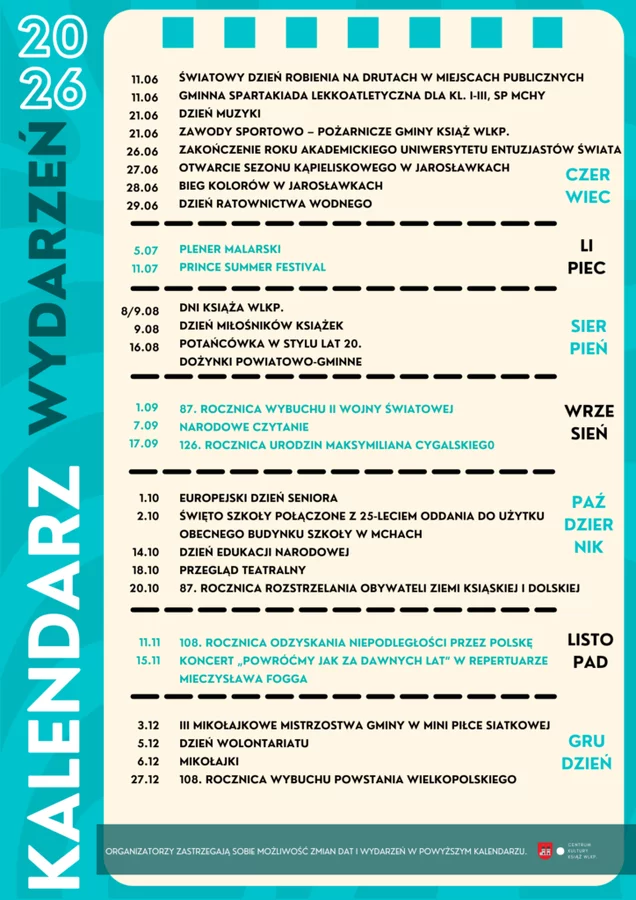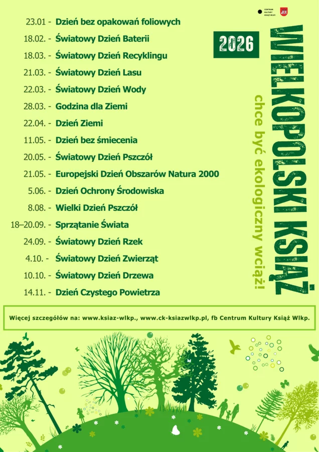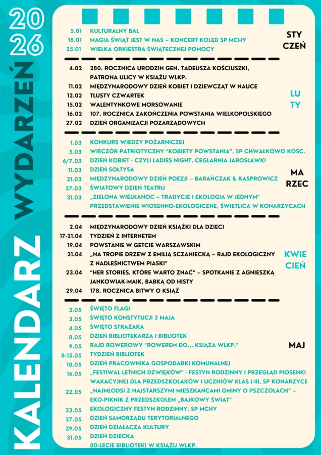 Zapraszamy do zapoznania się z kalendarium wydarzeń kulturalno - sportowych oraz kalendarzem akcji ekologicznych, zawierających informacje o planowanych wydarzeniach w 2026 roku.
