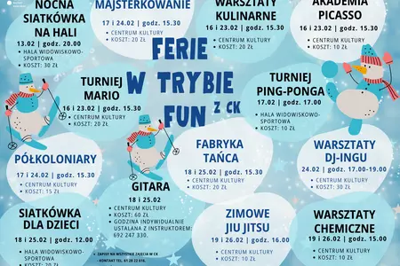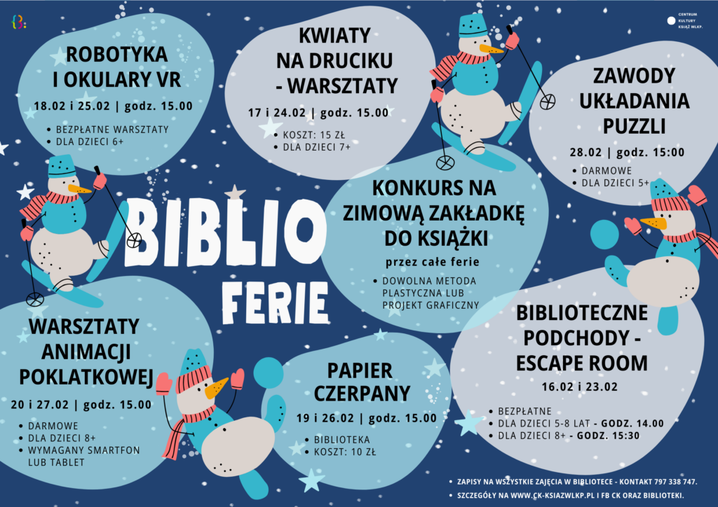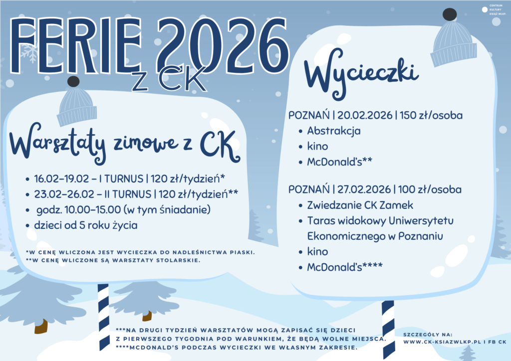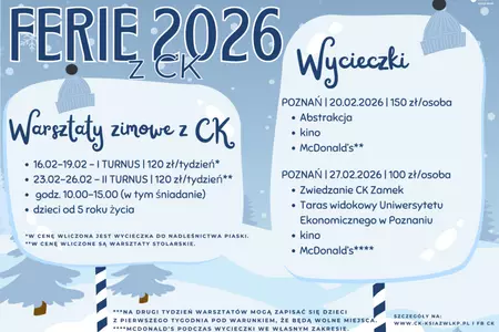 Choć do ferii zimowych zostały dwa tygodnie już teraz warto zapoznać się z ofertą przygotowaną przez Centrum Kultury Książ Wlkp., która jak co roku wychodzi z bogatymi propozycjami zajęć, półkolonii, wycieczek, warsztatów dla dzieci i młodzieży. W tym roku w Wielkopolsce zimowy odpoczynek od zajęć szkolnych rozpocznie się 16 lutego i potrwa do 1 marca. A ponieważ pogoda bywa zmienna i nie zawsze możliwe są zabawy na świeżym powietrzu, warto na bieżąco śledzić stronę Centrum Kultury Książ Wlkp. https://ck-ksiazwlkp.pl/ , które na bieżąco umieszcza ciekawe i kreatywne zajęcia podczas ferii. Na co zatem mogą liczyć uczniowie spędzający ferie w domu.