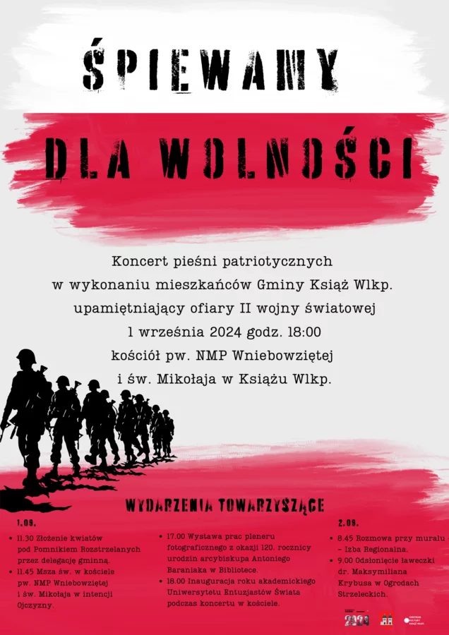 Zbliża się 85. rocznica wybuchu II wojny światowej. Z tej okazji mieszkańcy Gminy Książ Wlkp. pragną śpiewająco upamiętnić wszystkie osoby, które bohatersko walczyły o niepodległość Polski. W niedzielę, 1 września o godzinie 18.00 w kościele pod wezwaniem NMP Wniebowziętej i świętego Mikołaja w Książu Wlkp. odbędzie się koncert pieśni patriotycznych. W murach świątyni rozbrzmią najbardziej znane utwory z okresu II wojny światowej, które były nieodłączną częścią podtrzymania społeczności na duchu w tym trudnym czasie.