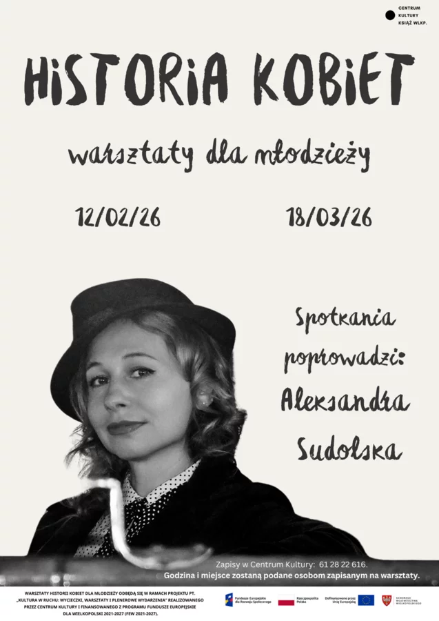 Warsztaty historii kobiet dla młodzieży odbędą się w ramach projektu pod tytułem „Kultura w Ruchu: wycieczki, warsztaty i plenerowe wydarzenia” realizowanego przez Centrum Kultury i finansowanego z programu Fundusze Europejskie dla Wielkopolski 2021-2027 (FEW 2021-2027).