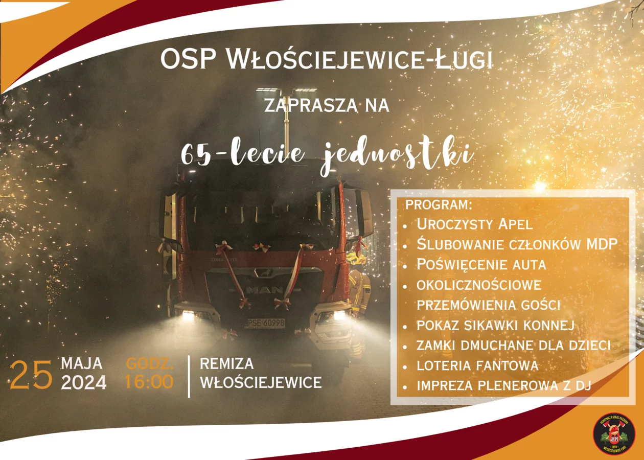 Kolejnego dnia – w sobotę, 25 maja Ochotnicza Straż Pożarna Włościejewice-Ługi świętować będzie 65-lecie istnienia jednostki. Ważnym punktem wydarzenia będzie poświęcenie nowego wozu bojowego. Ponadto nie zabranie wielu akcentów strażackich, takich jak na przykład ślubowanie członków Młodzieżowej Drużyny Pożarniczej czy pokaz sikawki konnej i wielu innych atrakcji. Kto z Państwa ma ochotę świętować jubileusz ze strażakami-ochotnikami zapraszamy od godziny 16.00 do Włościejewic. Szczegóły znajdą Państwo na poniżej zamieszczonym plakacie.