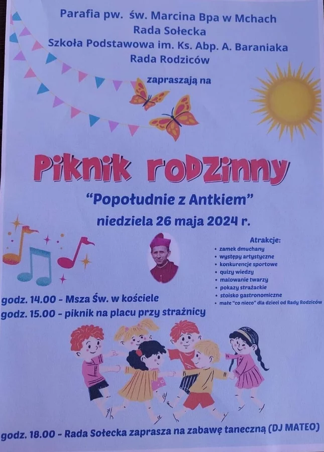 Niedziela, 26 maja to z kolei ważne święto dla wszystkich kobiet, które doczekały się pociech. Dzień Matki to doskonała okazja, aby wspólnie spędzić czas i doskonale się bawić na… Pikniku rodzinnym „Popołudnie z Antkiem”, który odbędzie się na placu przy strażnicy w Mchach. Poprzedzony zostanie mszą świętą o godzinie 14.00 w tamtejszej parafii pw. Marcina Biskupa, a po nabożeństwie mnóstwo atrakcji zarówno dla tych mniejszych, jak i dorosłych mieszkańców. Szczegóły na poniżej zamieszczonym plakacie.