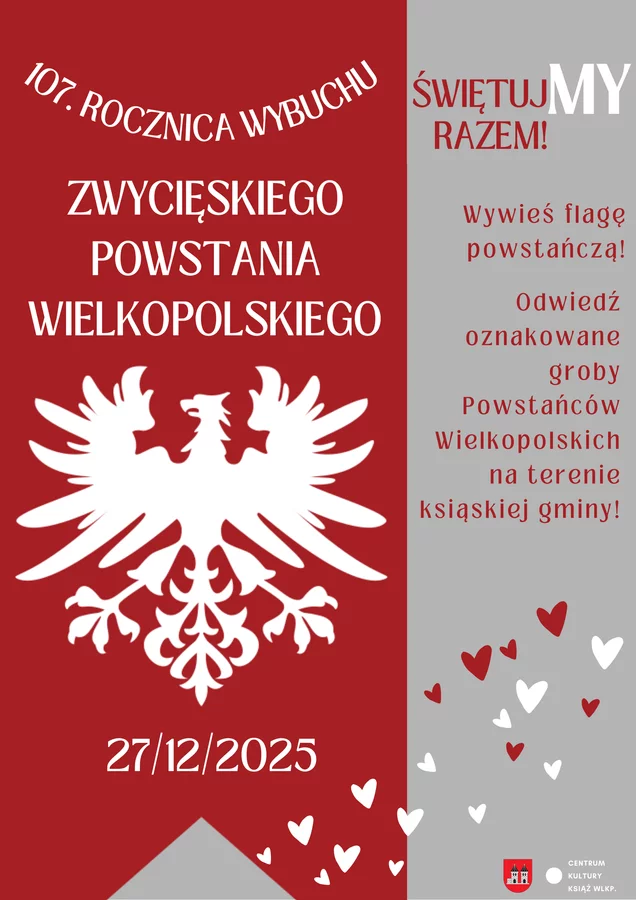 Jednocześnie, w imieniu Marszałka Województwa Wielkopolskiego, Marka Woźniaka zapraszamy do udziału w głównych uroczystościach 107. rocznicy Powstania Wielkopolskiego, które zaplanowane zostały w dwóch terminach i dwóch lokalizacjach: 27 grudnia w Poznaniu, a dzień później - w Warszawie. Agenda obu wydarzeń dostępna jest na stronie https://27grudnia.pl/strony/107-rocznica-wybuchu-powstania-wielkopolskiego/9215 ŚwiętujMY razem.