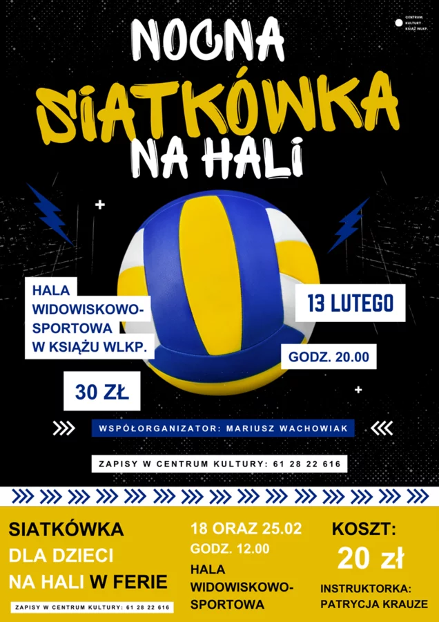 Szczegóły dotyczące godzin i opłat wpisowych, dostępne są pod adresem: https://ck-ksiazwlkp.pl/nocna-siatkowka-na-hali/ i https://ck-ksiazwlkp.pl/kto-zostanie-mistrzem-ping-ponga/ i na załączonych plakatach.
