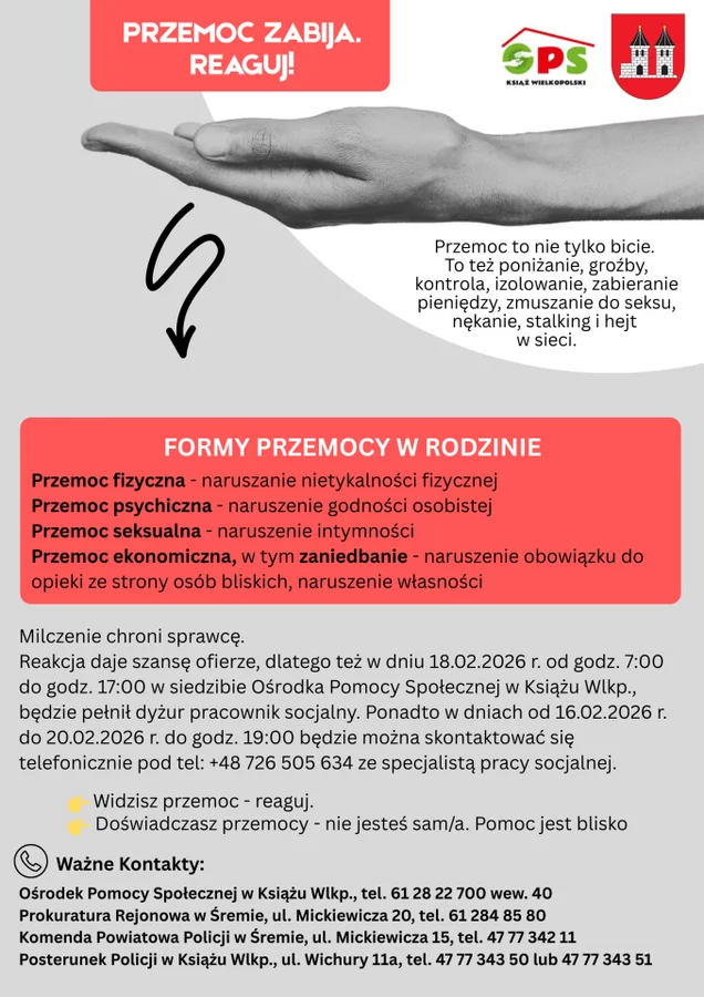 · Ośrodek Pomocy Społecznej w Książu Wlkp.: 61 28 22 700 wew. 40 lub 726 505 634