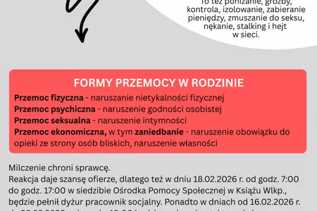 W siedzibie Ośrodka Pomocy Społecznej w Książu Wlkp., 18 lutego 2026 roku w godzinach od 7.00 do 17.00 będzie można skorzystać z pomocy dyżurującego pracownika socjalnego.