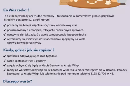 Ksiąski Ośrodek Pomocy Społecznej serdecznie zaprasza osoby starsze do udziału w bezpłatnych warsztatach integracyjnych z psychologiem pod nazwą „Między nami seniorami”, organizowanych w miejscowym Klubie Seniora z myślą o potrzebach i codziennych wyzwaniach osób w podeszłym wieku.