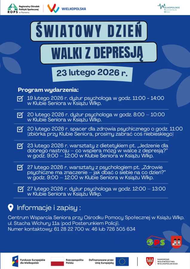 W związku ze Światowym Dniem Walki z Depresją, obchodzonym 23 lutego, Ośrodek Pomocy Społecznej w Książu Wlkp. zaprasza mieszkańców do udziału w działaniach edukacyjnych i profilaktycznych poświęconych zdrowiu psychicznemu. Depresji często towarzyszy uczucie niepokój i poczucie beznadziejności.