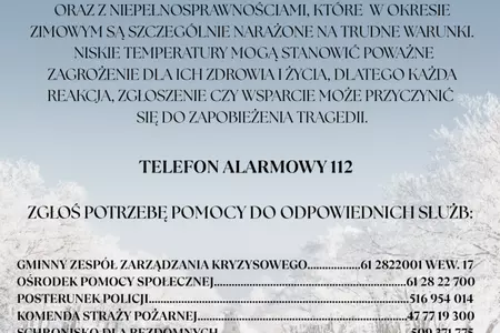 W celu zapewnienia bezpieczeństwa kierujemy prośbę o wzmożoną uważność, reagowanie na wszelkie sygnały dotyczące przebywania osób w miejscach pozbawionych ogrzewania oraz współpracę z jednostkami w celu zapewnienia niezbędnej pomocy osobom narażonym na negatywne skutki warunków pogodowych.