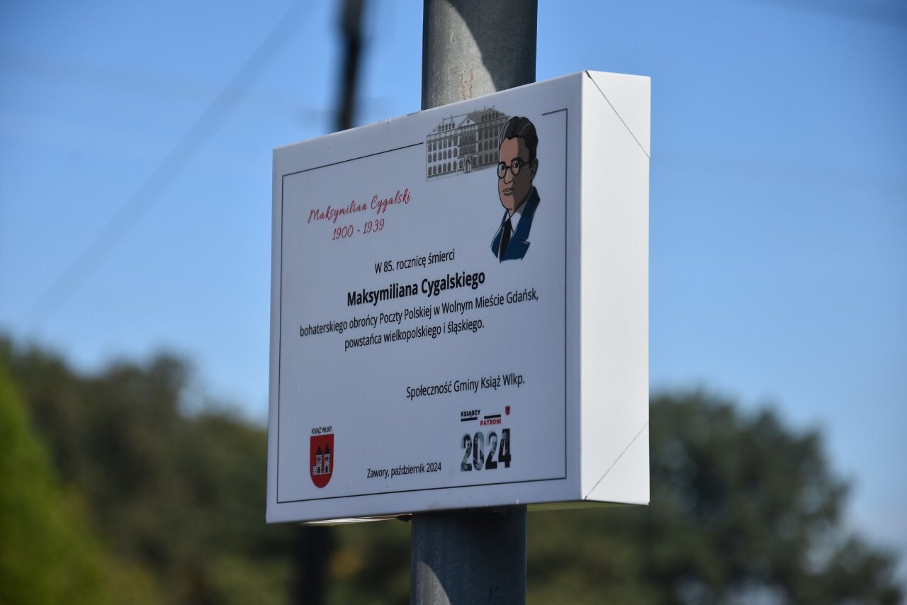 Dodatkowym punktem tegorocznych obchodów było odsłonięcie okolicznościowej tabliczki poświęconej pocztowcowi, znajdującej się na drogowskazie do Leśniczówki przy głównej drodze w Zaworach. Jej symbolicznego odsłonięcia dokonali przedstawiciele śremskiego Związku Kombatantów RP i Byłych Więźniów Politycznych. W ten sposób już od kilku lat ksiąski samorząd upamiętnia zasłużone osoby w historii Gminy Książ Wlkp., a tym roku w szczególności Ksiąskich Patronów. W ich gronie znalazł się również Maksymilian Cygalski, dlatego poniedziałkowa uroczystość była doskonałą okazją do takiej formy kultywowania pamięci o Jego osobie.