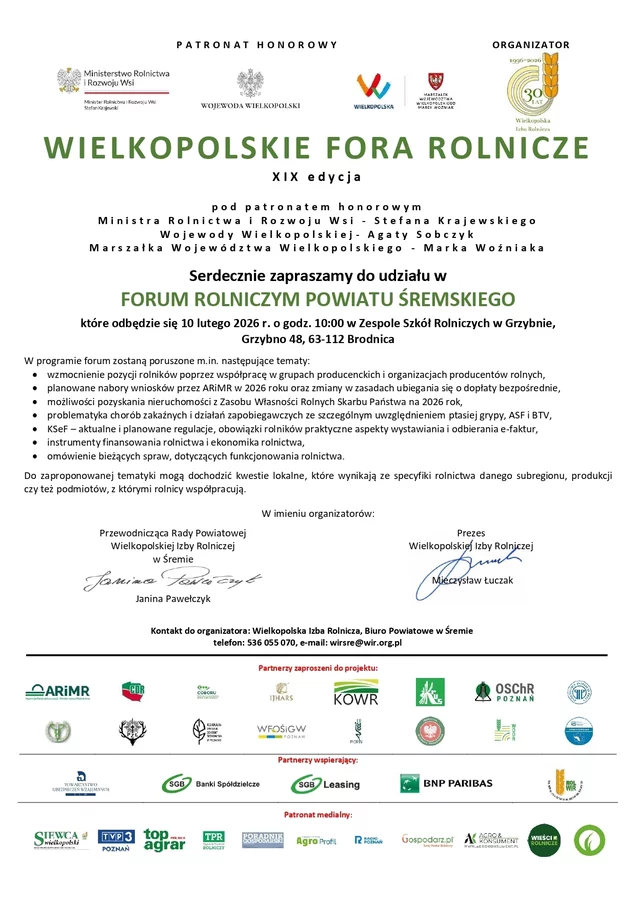 Wielkopolska Izba Rolnicza zaprasza do udziału w XIX edycji Wielkopolskich Forów Rolniczych, która w powiecie śremskim odbędzie się 10 lutego o godzinie 10.00 w Zespole Szkół Rolniczych w Grzybnie, Grzybno 48, 63-112 Brodnica.