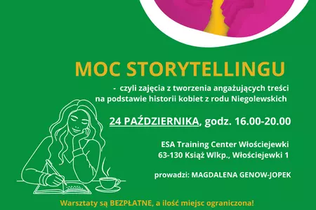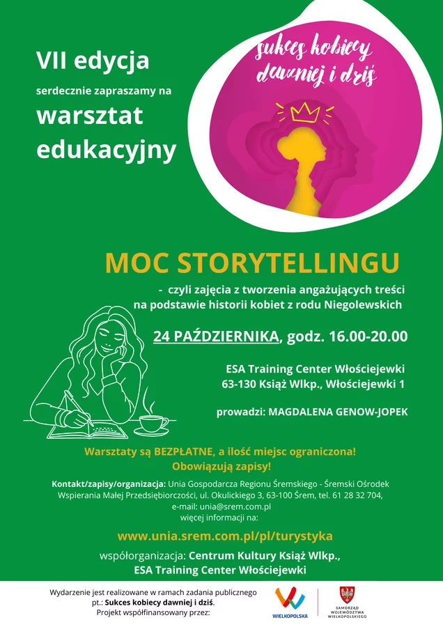 VII edycja warsztatu edukacyjnego „Moc storytellingu” w ramach projektu „Sukces kobiecy dawniej i dziś”, odbędzie się 24 października 2025 roku w godzinach od 16.00 do 20.00 na terenie ESA Training Center Włościejewki (wyjątkowe miejsce, na terenie którego mieści się pałac Niegolewskich). Wydarzenie organizowane jest przez Unię Gospodarczą Regionu Śremskiego - Śremski Ośrodek Wspierania Małej Przedsiębiorczości.